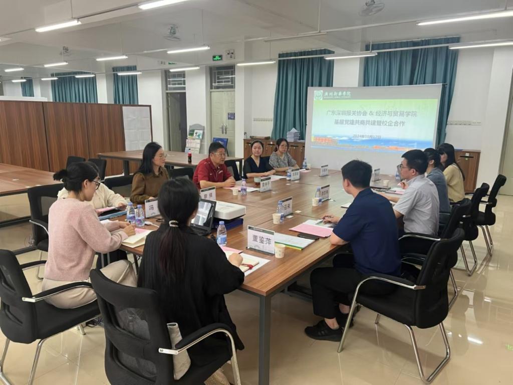为共同探索基层党建共商共建的新路径,深化校企合作,共同推动教育与产业深度融合,2024年10月17日广东深圳报关协会走访我院,共同召开基层党建共商共建暨校企合作座谈会。广东深圳报关协会党支部书记、副秘书长李志伟和宣传部主任钟召来,学院院长袁持平、副院长吴喜龄、党支部副书记李丹、办公室主任陈佳莉、国际经济与贸易专业副主任廖倩及国贸专业骨干教师冯椿、许夏冰、李亚芳、董鉴萍参加了此次座谈会。