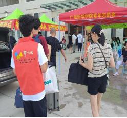 清晨,迎新志愿者一早到达迎新布置场地、整理无聊,随后投入到紧张的迎新工作中去,他们在迎新站点提供咨询与指引等帮助新生发放物资,完成报到工作。