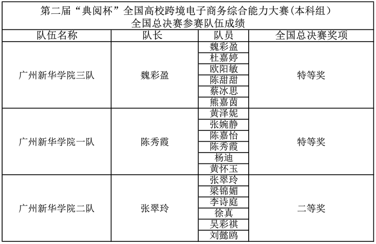从校级初赛、省级复赛到全国总决赛,本次大赛历时近3个月,在学院领导以及国贸专业老师的关心与支持下,参赛学生在每个赛段均以最佳状态备赛、比赛。经过激烈的角逐,广州新华学院3支学生队伍在全国总决赛中奋勇争先,尽显风采,其中,2支队伍斩获本次全国总决赛“特等奖”,1支队伍荣获全国总决赛“二等奖”,再次刷新了我校参加“典阅杯”全国高校跨境电子商务综合能力大赛的最好成绩。同时,我校在本次大赛组织有力,平稳有序,被授予“最佳组织奖”。