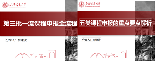 会议由上海交通大学教务处在线课程建设负责人和在线课程建设与申报专家余建波教授做了《第三批一流课程申报全流程》的专题报告。培训主要包括三个部分的内容:复盘分析一流课程的评审结果针对性指导第三批选题申报等问题、一流课程申报材料准备与填写指导、一流课程申报材料现场打磨,一对一进行课程材料指导。
