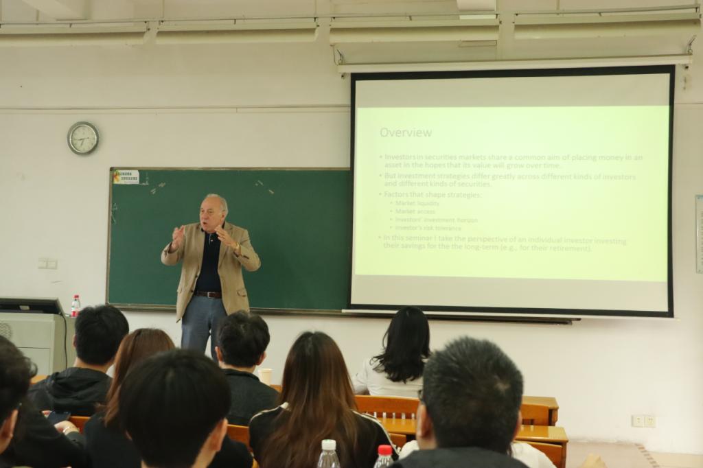 课程伊始,Anderson教授以“国际投资市场和长期投资策略”这一热门领域作专题讲授。他首先从个人投资者的角度阐述长期储蓄的投资策略:证券市场的投资者有一个共同的目标,希望投资的资产价值随着时间的推移而增长。然而投资策略具有异质性,影响投资策略的因素包括市场流动性、市场准入、投资者的投资范围和投资者的风险承受能力,并从消极投资和积极投资两个方面分析投资策略。