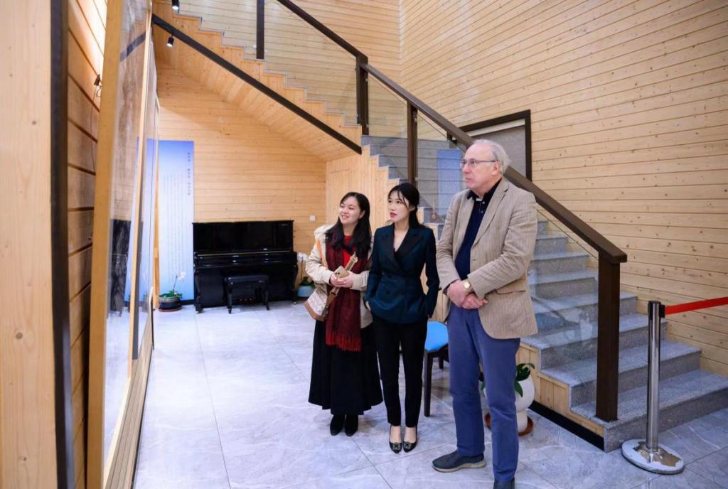 图2 刘婉莉(霖霖)、吴喜龄陪同Ronald Wayne Anderson教授参观画展