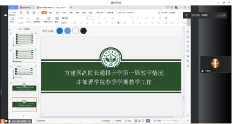 最后,方建国副院长通报学院开学第一周教学情况,部署学院春季学期教学工作。开学第一周,我院师生齐力传承并弘扬新华教学传统“四个一”,做好第一课、第一天、第一周、第一月的教学工作,为新学期书写新篇章打好坚实基础。他认为,第一周线下教学教风学风良好,教学秩序井然,教与学都呈现一片生气勃勃的新气象。任课老师们课前准备充分,在授课过程通过引例、设问、师生互动等方式给予学生引导,学生们在假期后也陆续恢复学习状态。他希望老师们能够提振士气、勠力同心,互相学习,以满腔热情和实际行动诠释教师的初心和使命。
