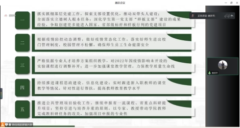 首先,袁持平院长、书记结合学校春季工作会议要点,从党政建设、疫情防控、教学管理、科研提升和师资建设等八个方面部署学院本学期党政工作:一是深入学习贯彻党的二十大精神,抓实抓细基层党建工作,深化“样板支部”建设的成果经验,争取创建更多优秀的党建项目;二是坚持落实“两个至上”,科学规范做好疫情防控常态化工作,确保校园安全和师生生命健康;三是严格依据专业人才培养方案组织教学,实时跟进新入职教师的课堂教学,进一步加强日常教学规范管理,力保教学质量生命线;四是推进公共管理项目整改工作,以专家、教授带动学院教师完成教科研任务的攻关,助力申报省一流课程、省重点科研提升项目,以项目申报引领科研工作新突破;五是对照转设工作的师资建设指标,重点引进高层次人才,建设“金字塔式”人才梯队,确保教师留得住、用的好;六是做好教师资格评定、职称评审、合同聘用、师德考核、年度考核等工作,鼓励教师参与“六大人才计划”和教学竞赛,提升教师综合水平;七是深化产、学、研、教、用融合,进一步在实习、创业、开发教学资源、师资队伍共建等方面深度合作,全面提高应用型人才培养质量;八是协同育人,加强辅导员与班主任合作,继续落实访企拓岗专项行动,全力促进2023届毕业生就业指导工作。