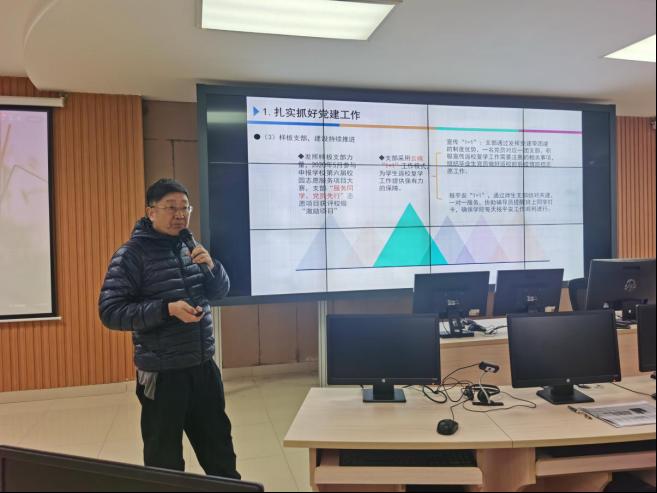 稍后,周开国副院长从学科、专业、课程三方面总结了2020年的工作。周副院长指出,教学方面,2020年网络教学成果可喜,这也为未来线上、线下相结合的教学模式提供了新思路。科研方面,我院以省级特色重点学科为依托,在科研、课程、人才培养等方面取得成绩,但他也强调了核心论文的重要性,激励教师发表高质论文。课程方面,他认为各个专业应提早规划,以省级一流课程为目标,加强专业课程建设。最后,周开国副院长展望了2021年的工作,他指出,2021年仍是机遇与挑战并存的一年,希望全院教职工能团结协作,加强沟通,通过举办教学、科研等交流分享会,更好地提升教师的教学科研能力,更好地推进2021年的工作。