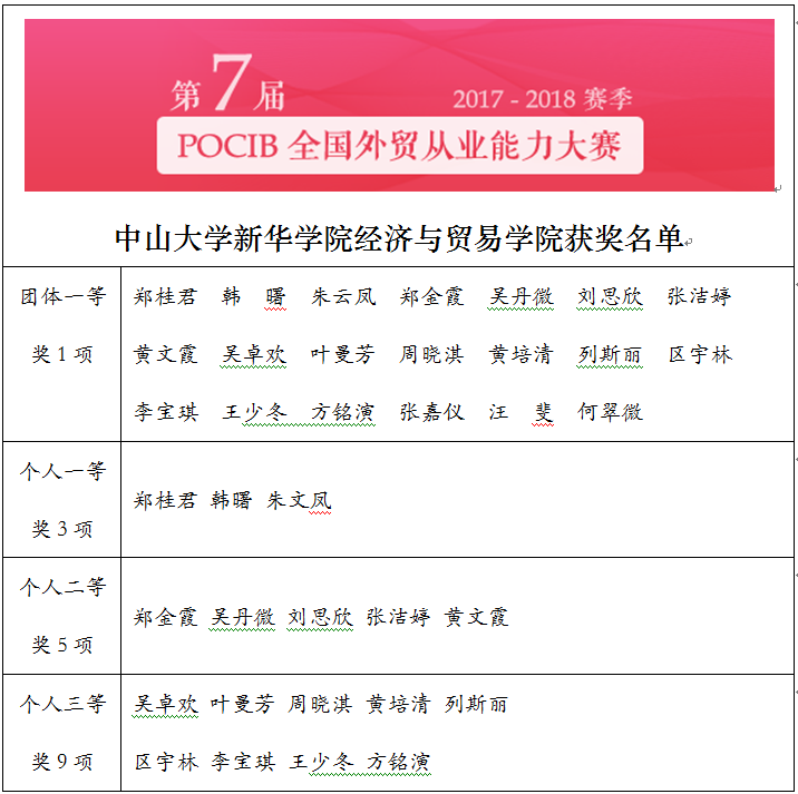 2017年11月28日,历时20天的全国大学生外贸从业能力大赛(简称:POCIB大赛)秋季赛终于落下了帷幕。由我校2015级国际经济与贸易专业的20名同学组成的中山大学新华学院参赛队伍一举斩获本次比赛的团体一等奖以及17项个人奖项,其中3人获得个人一等奖,5人获得个人二等奖,9人获得个人三等奖。