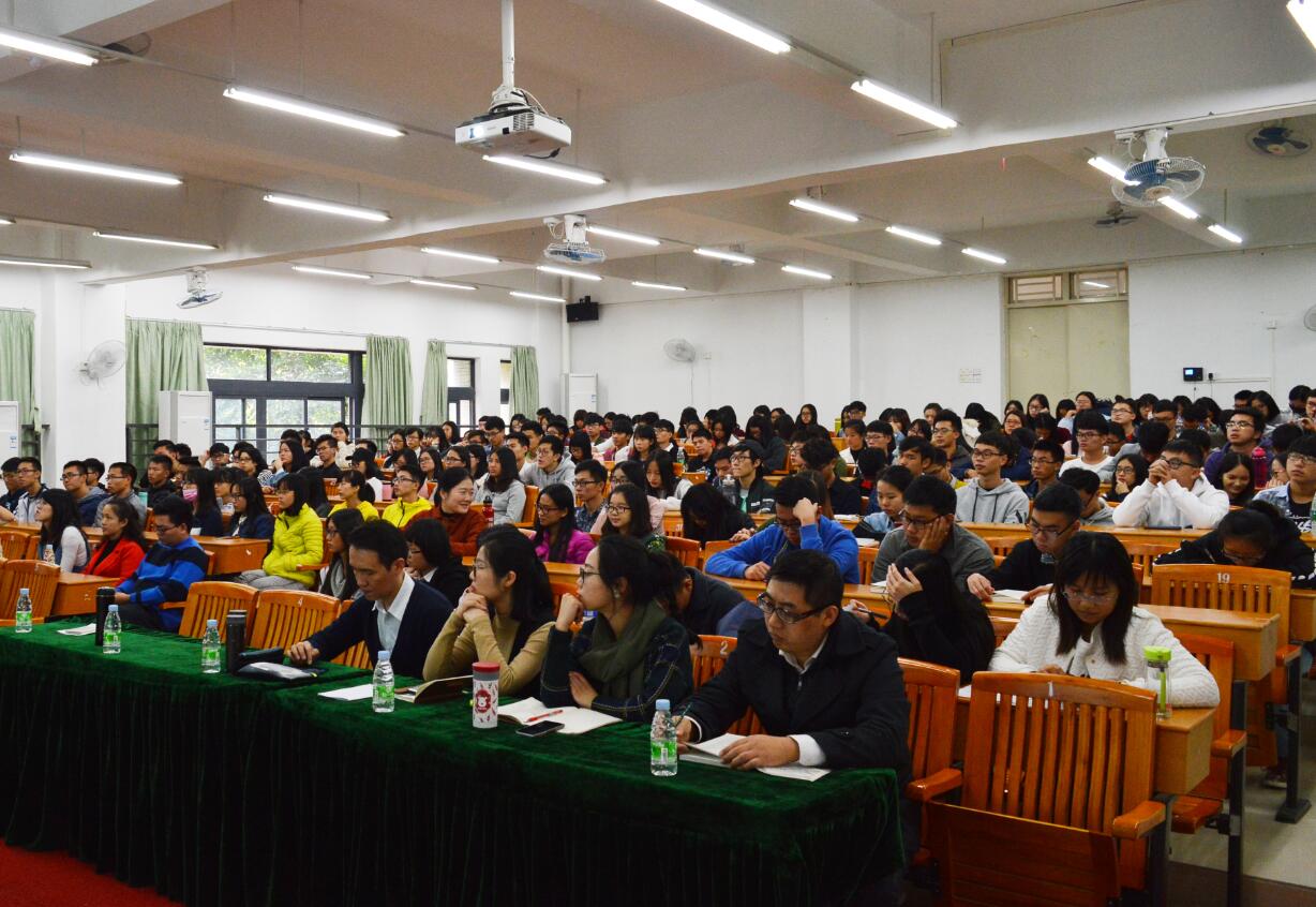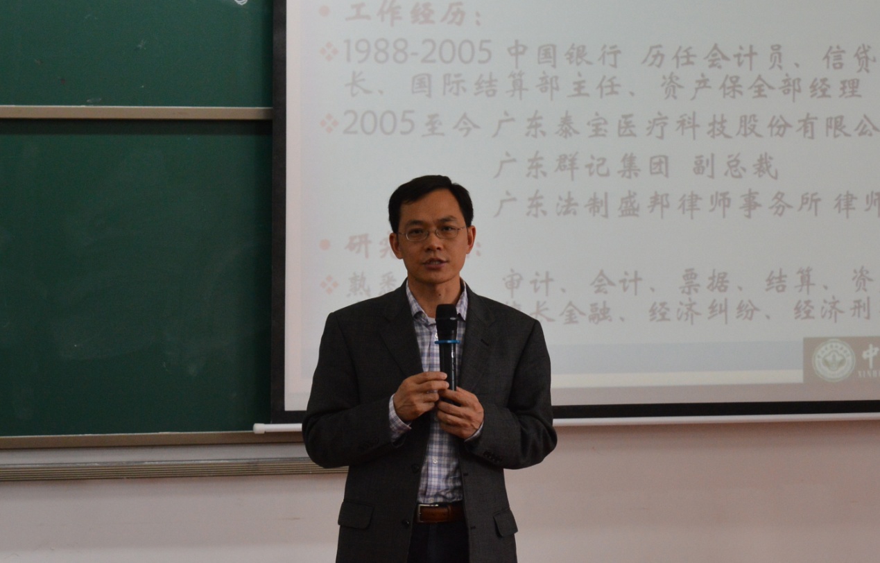 11月30日下午,泰宝医疗副总经理、中山大学新华学院经济与贸易系(下面简称经贸系)双师型教师庄壮辉老师到我院东莞校区作题为“科技金融——论专利、品牌、金融”的专题讲座。经贸系金融工程专业学科带头人周开国教授、金融工程专业副主任蔡婕萍老师、投资学专业副主任孔岩老师以及金工、投资学专业教师出席会议,金融工程专业200多名学生到场听讲。讲座由周开国教授主持。