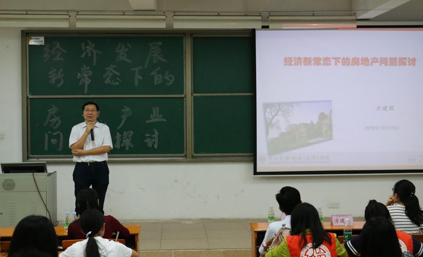 10月15日上午,中山大学新华学院经济与贸易系副主任、中山大学岭南学院副教授方建国应邀经济与贸易系建系十周年庆系列讲座经贸论坛之经济学专场,开展“经济新常态下的房地产问题探讨”的学术讲座。
