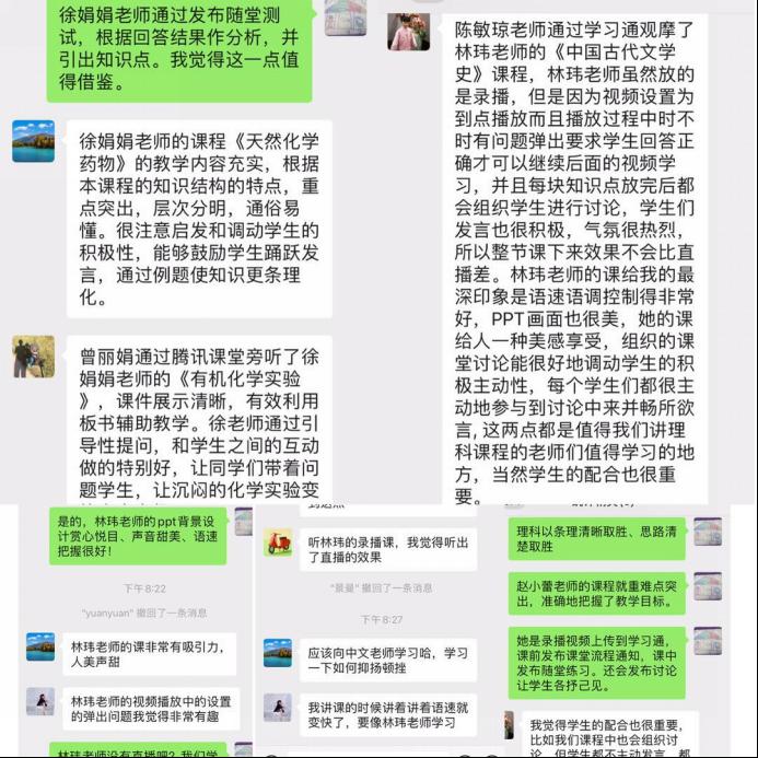 学习结束后,李芳凤副主任组织召开集中讨论会。会上,她首先强调了此次活动的重要性,并简述自己的学习心得。稍后,与会教师也分享了不同的学习心得,他们一致认为此次推选的“在线教学之星”文理兼具,教学方式各有特点,例如林玮老师语调抑扬顿挫,赵小蕾老师逻辑清晰,徐娟娟老师循循善诱。我院教师纷纷表示,线上学习活动不仅有助于提高教学质量,也为开展更加生动的教学活动提供了参考。