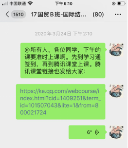 网络教学的课程控制是个重点,也是个难点。一个班级七八十位同学,分散在七八十个地方。事实上,他们开了电脑然后去干嘛老师都不知道,完全靠学生自觉是根本不可能的,所以就必须采取有效的控制方法。我采用的方法是主要包括:每次课上课之前提前5分钟到微信通知(如下图),大家先到学习通签到,然后接着到腾讯课堂上课。这个过程不断提醒还未签到的同学,让大家养成了按时签到学习的好习惯。腾讯课堂上课之前要同学们回复1、2的方式确认一下是否能够清晰听得到老师的声音以及看得到老师的PPT。课堂的讲解过程中随时互动,一般也是用回复1或者2的方式互动,提高大家学习的活跃度。每次安排幕课、作业或者实操,一般都会给出明确的任务书以及完成的时间,明确告诉学生什么时候要回到腾讯课堂(如下图)。每次上课之前或者完成作业、幕课和实训之后回到课堂,学生都必须按要求签到(如下图)。三节课上完时进行最后一次签到。如此,可以避免学生签到之后逃之夭夭。