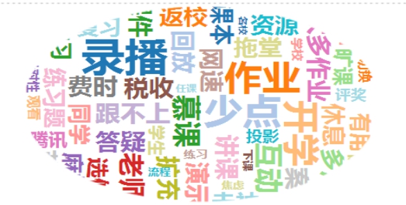 从学生对于网络教学提供的建议进行调查,剔除“无建议”或“挺好”等反馈后,获得154条有效建议。对有效建议做词频分析,出现频率排名前三的词汇分别为:作业少点、录播、 开学。表明在线教学过程中师生之间互动需求增加,学生希望少些录播和慕课,返学愿望强烈,课后作业给学生带来一定压力。