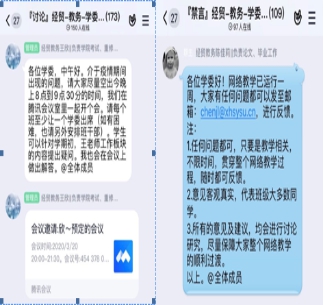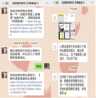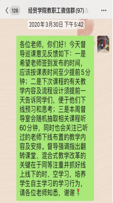 我院网络教学质量保障工作小组,深度参与网络课堂,每天收集分析有关教学效果、课程改进提升及教学过程中主要问题等实时数据,并在经贸期初教学工作筹备组发布,方建国副院长则针对当天网络教学反馈问题及时做出指导,确保教学质量与学习成效不降低。