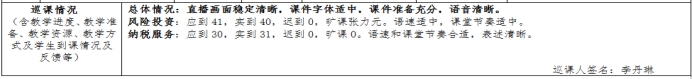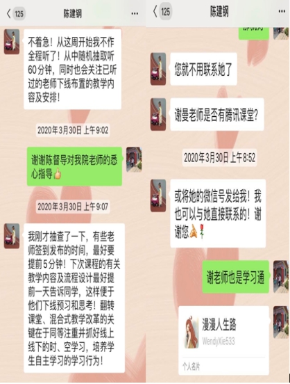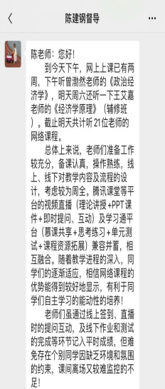 学校教学督导陈建钢老师自网络教学实施以来,迅速启动工作,建立“一看、二听、三谈、四总结”工作模式。“一看”是看教师在平台的课件、资源及测试等,看教师在交互平台上与学生交流情况;“二听”是督导进入线上直播课堂,跟随师生课堂教学全过程;“三谈”是督导课下与教师进行深入交流,了解教师的心得体会;“四总结”是督导听课之后当天对听课情况进行总结并及时反馈给我院教务管理人员。