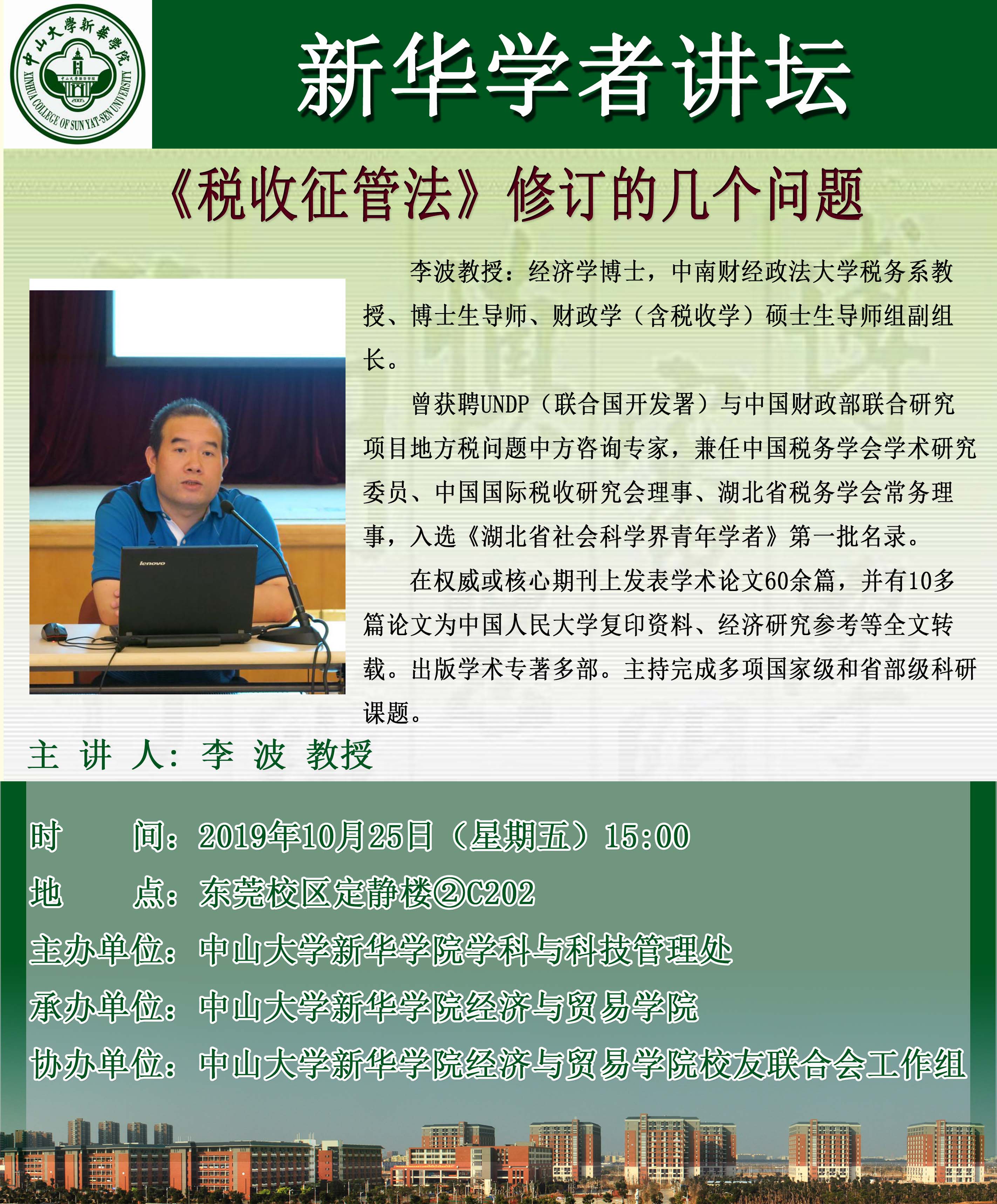 李波教授:经济学博士,中南财经政法大学税务系教授、博士生导师、财政学(含税收学)硕士生导师组副组长。