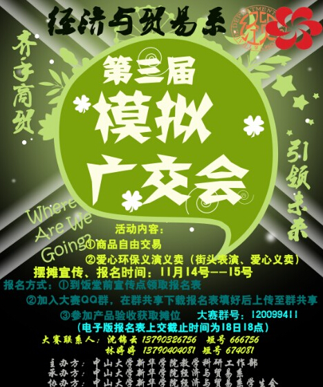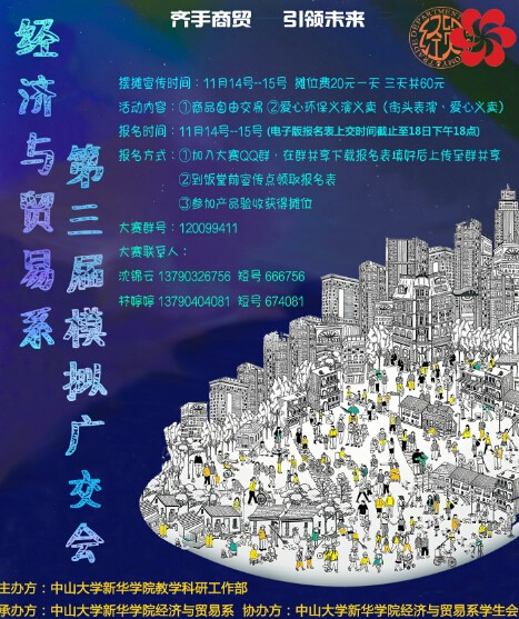 风气经贸,四海相知——经贸系模拟广交会重磅归来!你想赚取人生的第一桶金吗?你想锻炼自己的经营能力吗?你又是否想将自己的商业灵感付诸于行动、想为自主创业积累经验?11月26号至28号,东莞校区一栋宿舍楼旁空地,第三届模拟广交会为你搭建平台!本次活动分为商品自由交易区、义演和义卖三大区,在这里,你可以竞投摊位成为商家,出售商品,广交朋友,积累经验;在这里,你可以目睹各表演团的才艺表演,收获一份精彩;在这里,你可以捐赠自己的图书帮助到贫困山区的孩子,奉献一份爱心。