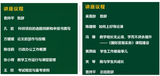主题二:教务工作知多点。讲座特邀我院办公室陈佳莉主任、张小辉副主任和王欣老师担任主讲嘉宾,她们详细介绍了教务管理与服务的相关内容与要求,帮助青年教师们提高工作效率。