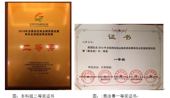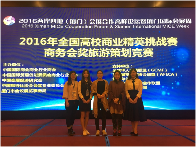 我院经贸系经济学会展方向学子在全国高校商业精英挑战赛商务会奖旅游策划竞赛总决赛中荣获本科组二等奖及展洽组一等奖的佳绩。2016年11月7日—9日,由中国国际贸易促进委员会商业行业分会、中国国际商会商业行业商会、中国会展经济研究会、中国旅行社协会会奖专业委员会、厦门市会议展览事务局共同主办的2016年全国高校商业精英挑战赛商务会奖旅游策划竞赛总决赛(以下简称“总决赛”)在福建省厦门市举行。我院经贸系经济学会展方向的梁碧娴、王巧妹、杨瑾三位同学所组成的新华学院代表队“以梦为马”,在夏淼、谭健萍、吴垠三位老师的精心指导下,首次参加全国比赛,顺利进阶总决赛并最终荣获本科组二等奖及展洽组一等奖的优秀成绩。
