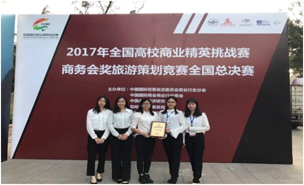 近日,我校经贸学院经济学(会展方向)专业的杜香凝、何惠珍、李秋婷和谢迪君四位同学组成的中山大学新华学院代表队“DHLX团队”,在谭健萍、吴垠、张才华、蓝舟琳和黄小润五位老师的精心指导下,在2017年“全国高校商业精英挑战赛商务会奖旅游策划竞赛”全国总决赛中,荣获本科组方案策划一等奖及展洽组一等奖的佳绩!