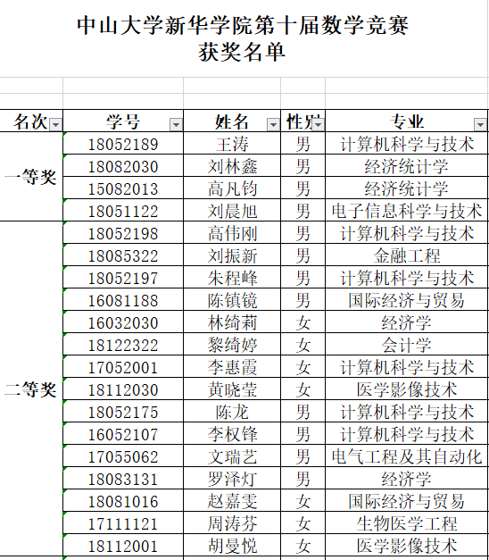 附2:中山大学新华学院第十届数学竞赛获奖名单