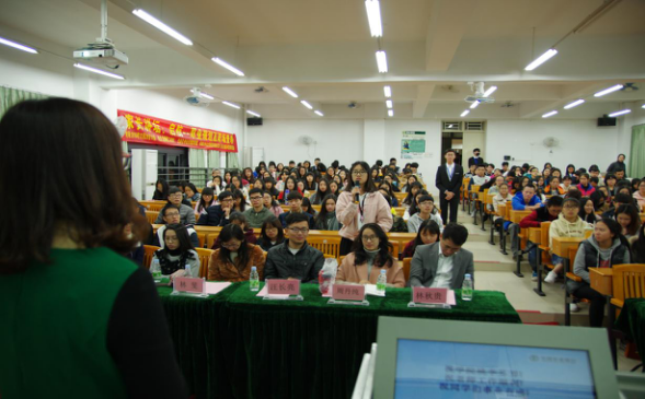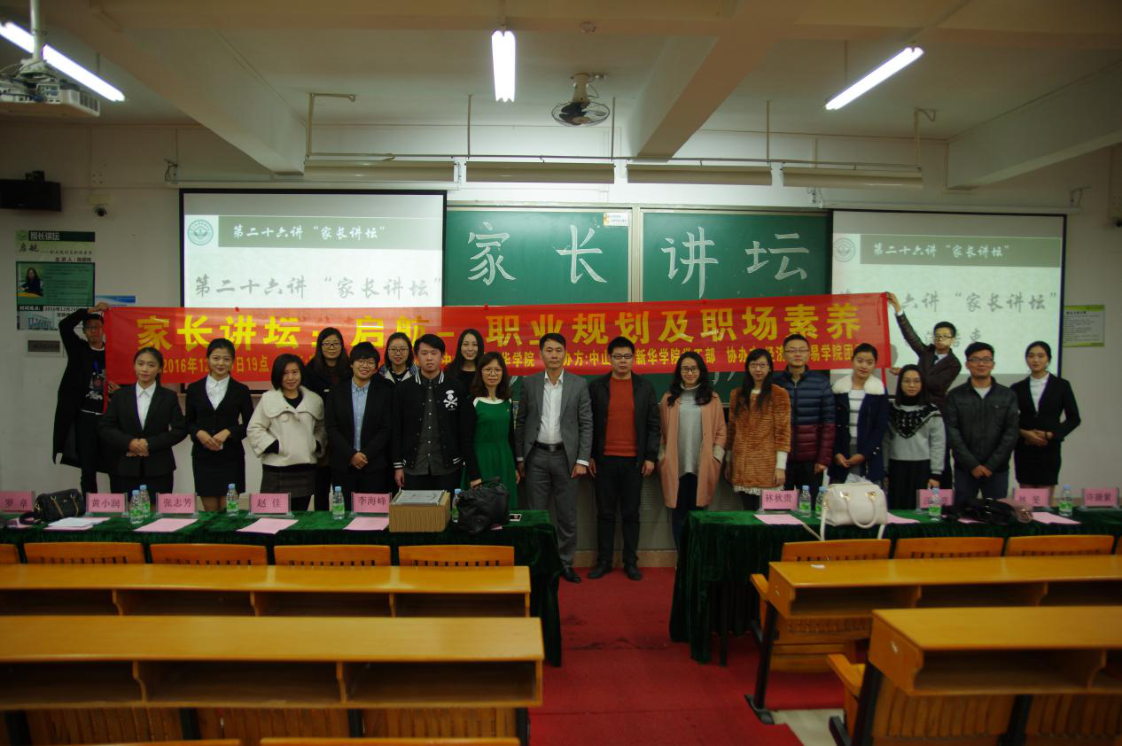 由中山大学新华学院学生工作部主办,suncitygroup太阳新城院团委承办,第二十六讲家长讲坛——“启航之职场素养与职业规划”于2016年12月29日晚19:00在定静楼②A201举行,由经贸学院老师冒娟主持。本次家长讲坛的主讲嘉宾是2014级金融工程专业潘家乐同学的母亲,现任中国农业银行东莞分行党委组织部部长兼人力资源部总经理陈爱嫦女士。出席嘉宾有中山大学新华学院校长助理、学生工作部部长林秋贵,经贸学院办公室副主任、院团委书记李海峰,院团委副书记赵佳,院团委副书记张志芳,学生工作部老师周丹纯,以及suncitygroup太阳新城老师刘黎、罗卓、黄小润、汪长亮、林斐、郑银珊、许搪紫。