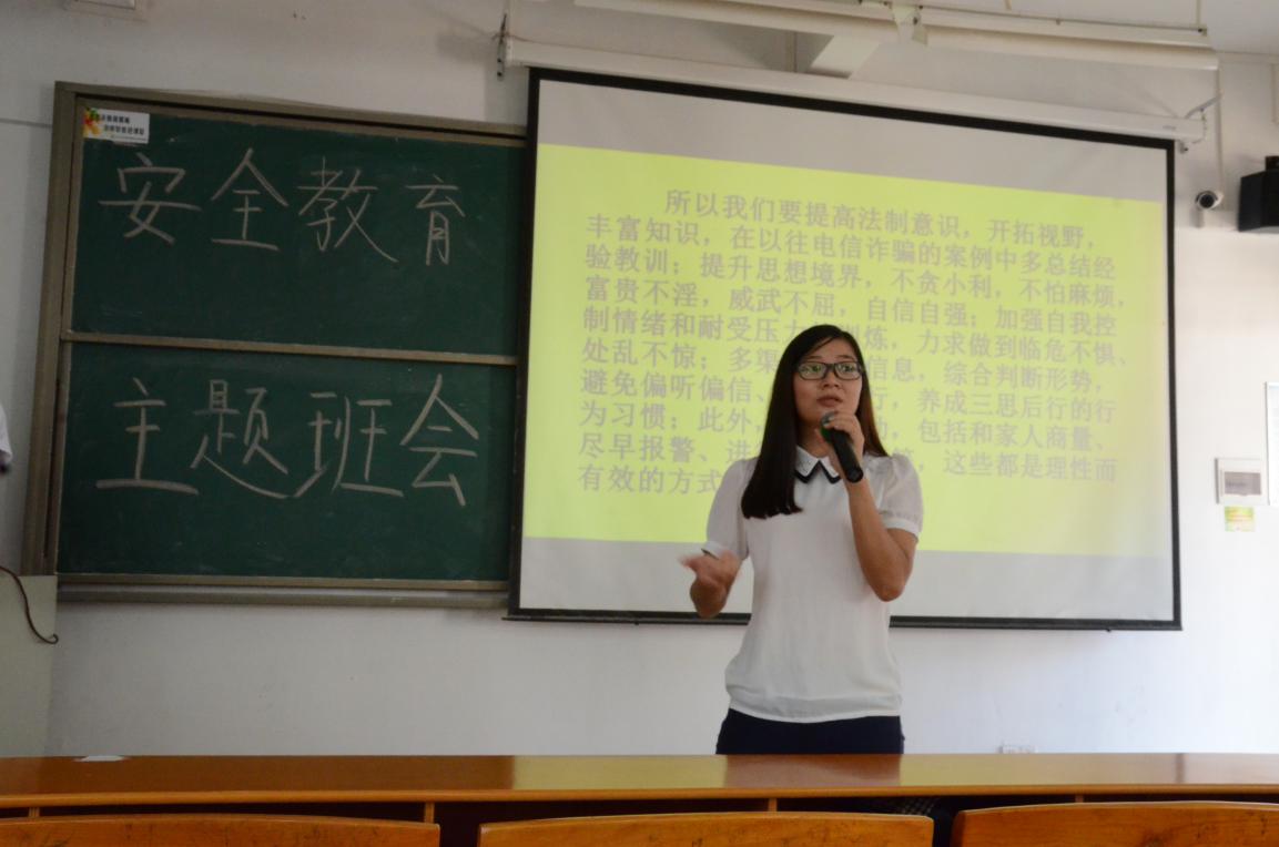 近日,山东、广东等地连续发生3起学生遭电信网络诈骗案件,导致受害人猝死或自杀,引起社会广泛关注。为切实增强学生的安全防范意识和提高学生的抗压能力,创建和谐安全的校园环境。2015级国贸A班于2016年9月14日下午在教二D501开展以“安全伴我行”为主题的班会。出席本次主题班会的嘉宾有经济与贸易系主任袁持平教授,国贸专业副主任吴喜龄老师以及杨凌老师、黄小润老师。
