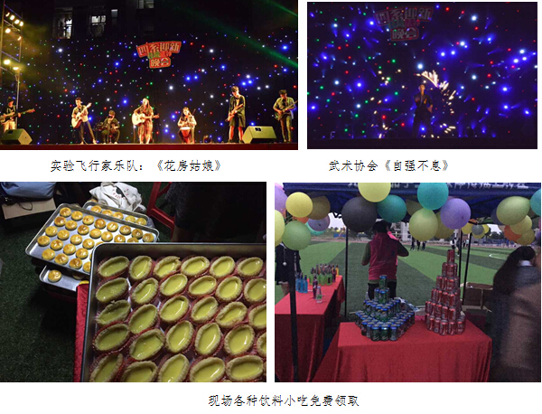校园歌手叶诗婕琳强悍演唱rolling in the deep,精准的英文咬字、恰到好处的动作表情以及专业的演唱水准,让现场的观众感受到黑夜中无尽的音乐魅力。rhythm boom 组合表演的b-box说唱节奏感十足,其所带来的Hip Hop元素令整个足球场瞬间嗨成潮流地带。实验飞行家乐队弹唱的《花房姑娘》带着浓郁而温暖的摇滚风打动了现场的每一个观众,驱走蒙蒙秋雨所带来的凉意。而武术协会所带来的激昂大气的武术表演《自强不息》,满满的正能量更是激励着同学们的心,将全场的气氛推向了高潮。观众们挥舞着的荧光棒与舞台灯光相呼应,整个足球场变得色彩斑斓,异常浪漫。
