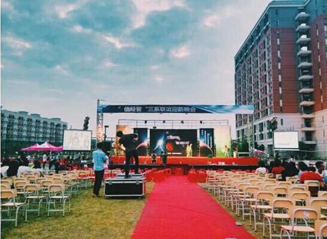 10月10日晚,由信科系、经贸系、管理学系三系合办的迎新联谊晚会,在我院东莞校区足球场大舞台举行。三星辉映,璀璨新华。出席本次晚会的领导和嘉宾分别是中大新华学院团委书记殷丹书记,中大新华学院团委余醒雅副书记,中大新华学院团委代亮老师,校园建设管理部谢凯忠主任,经贸系团总支书记李海峰老师,信科系团总支书记陈伟钊老师,管理学系团总支副书记张仲杰老师,经贸系团总支副书记陈忱老师,晚会总导演赵佳老师,以及各系各部门老师代表和各系学生会主席。