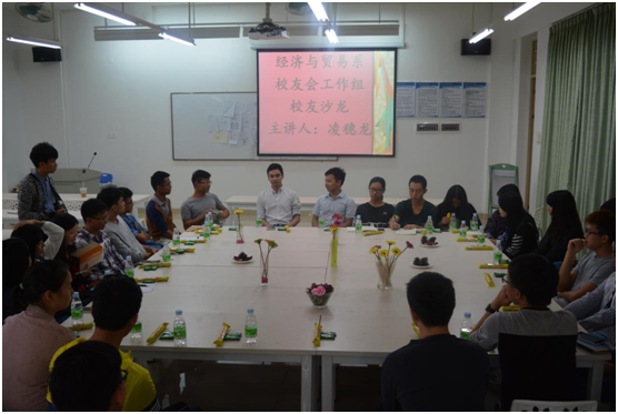 2015年12月2日下午14:30,由经济与贸易系校友会工作组首次举办的校友沙龙在东莞校区实验楼二B501会展经济实验室举行。出席本次座谈会的嘉宾为06级国贸专业的凌穗龙师兄、经贸系校友会工作组指导老师梁昌洲以及国贸专业学生代表。